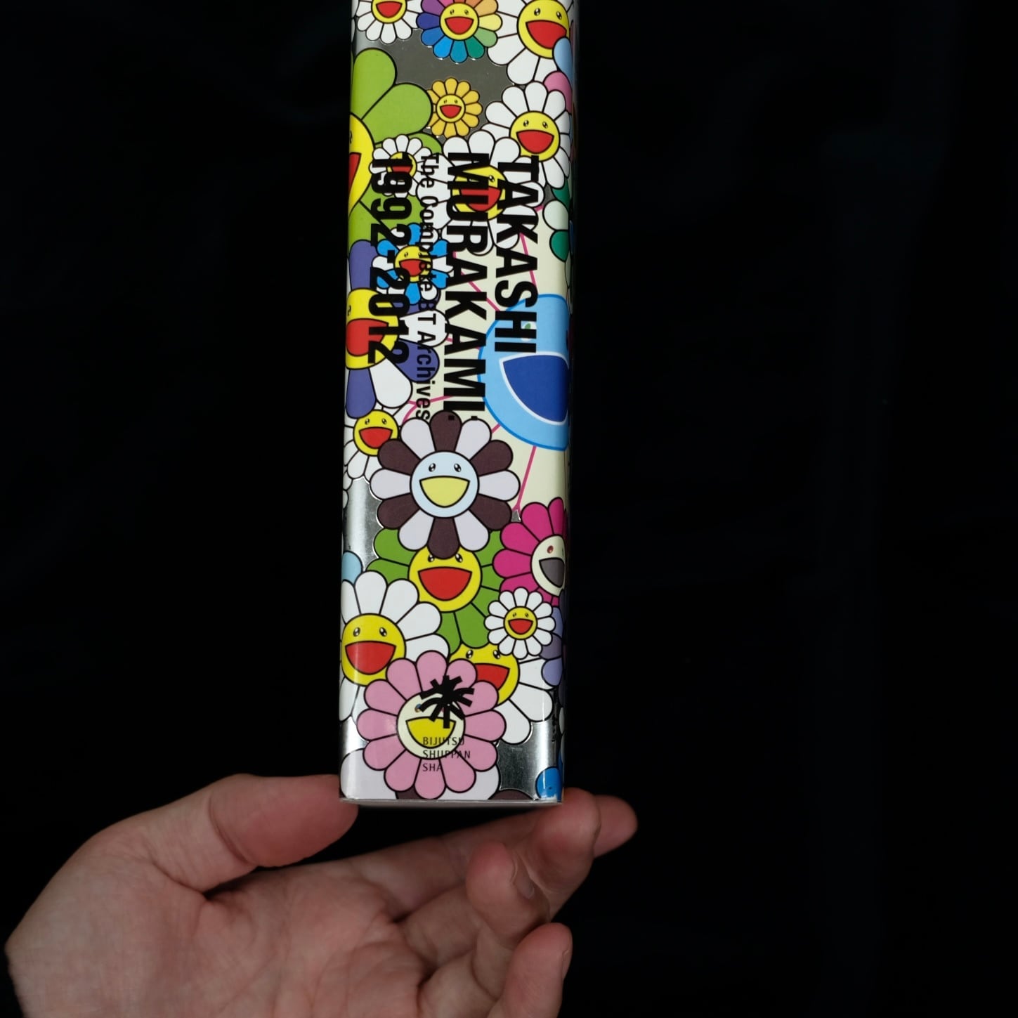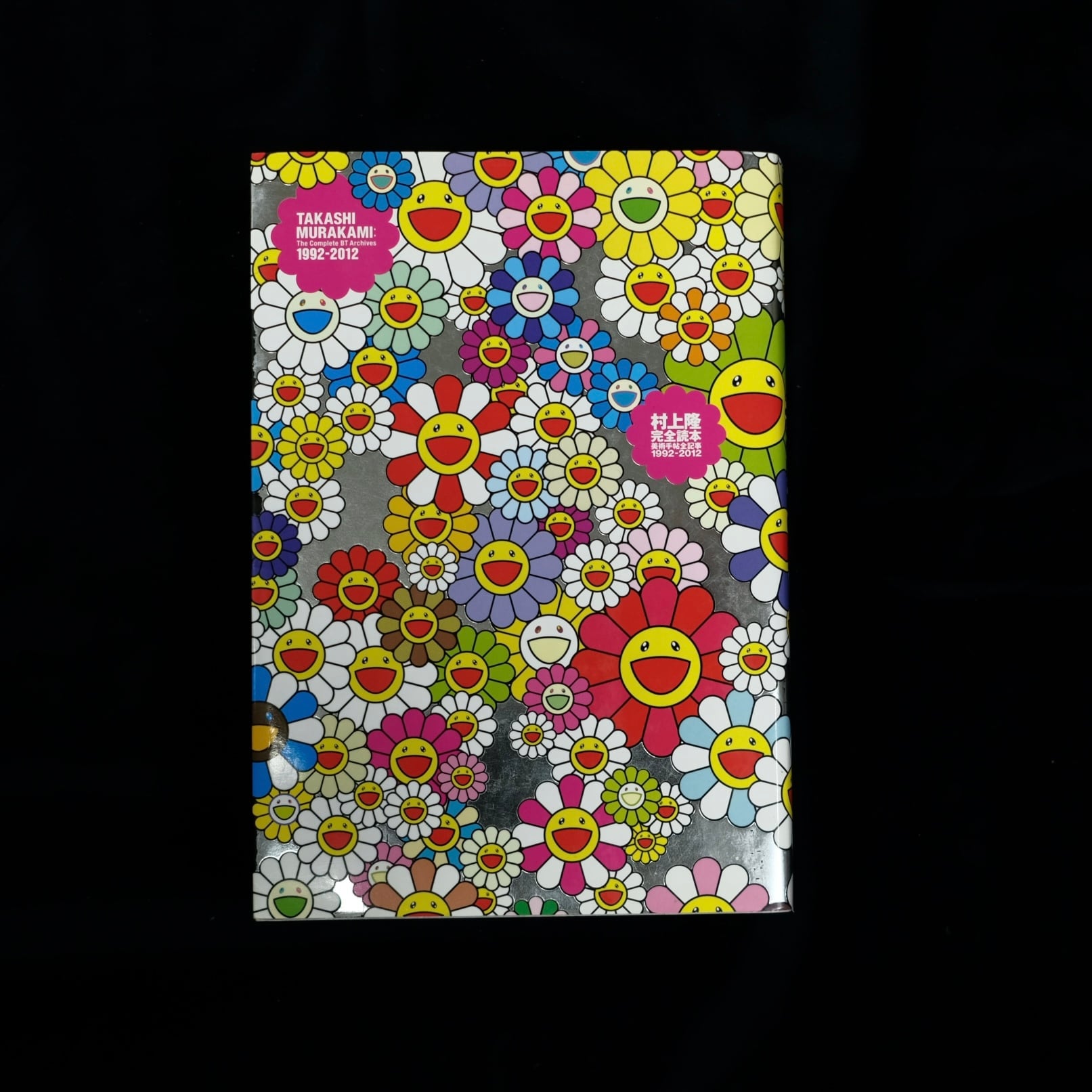 村上隆のアイコン「お花」が全面に描かれた、メタリックシルバーの華やかな装丁。